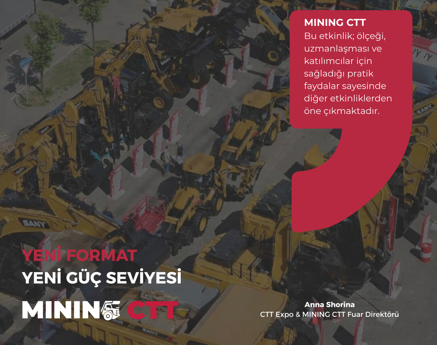26–29 Mayıs tarihleri arasında, EXPO kapsamında ilk uluslararası MINING CTT fuarını hayata geçiriyoruz. Bu fuar, madencilik sektörünün gerçek ihtiyaçlarına yanıt olarak oluşturulmuş, bağımsız bir projedir.